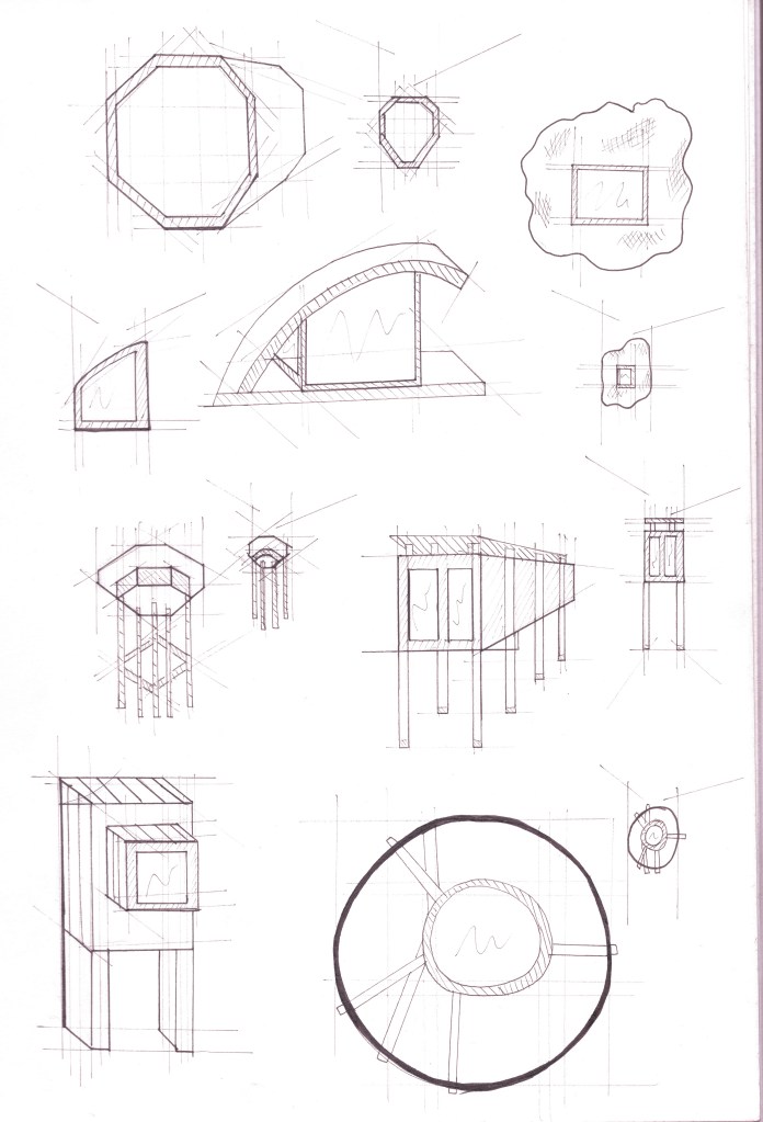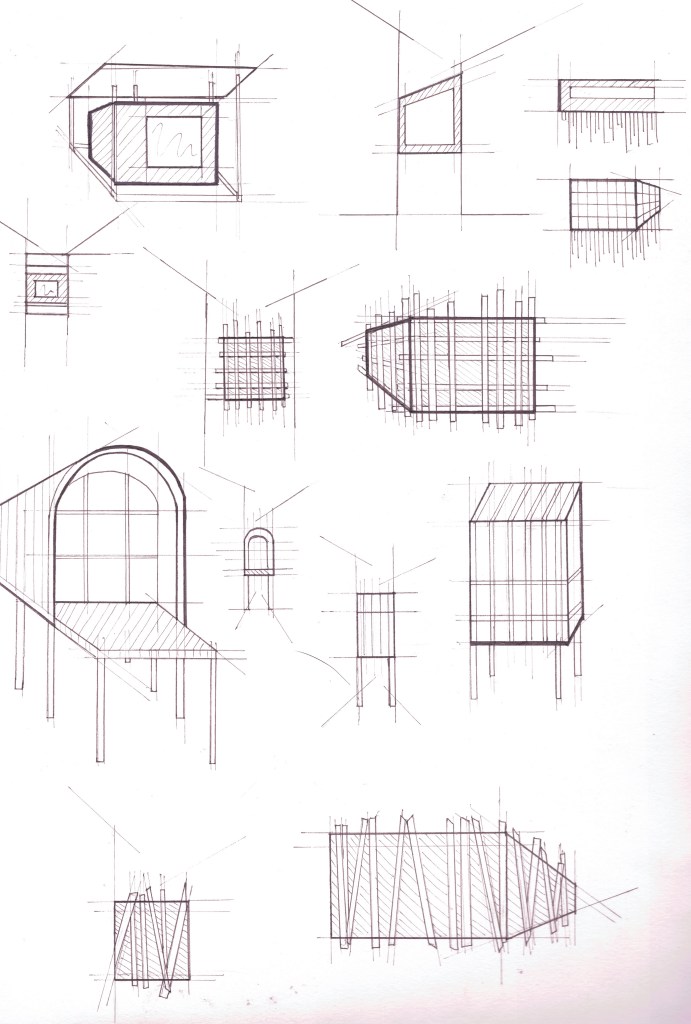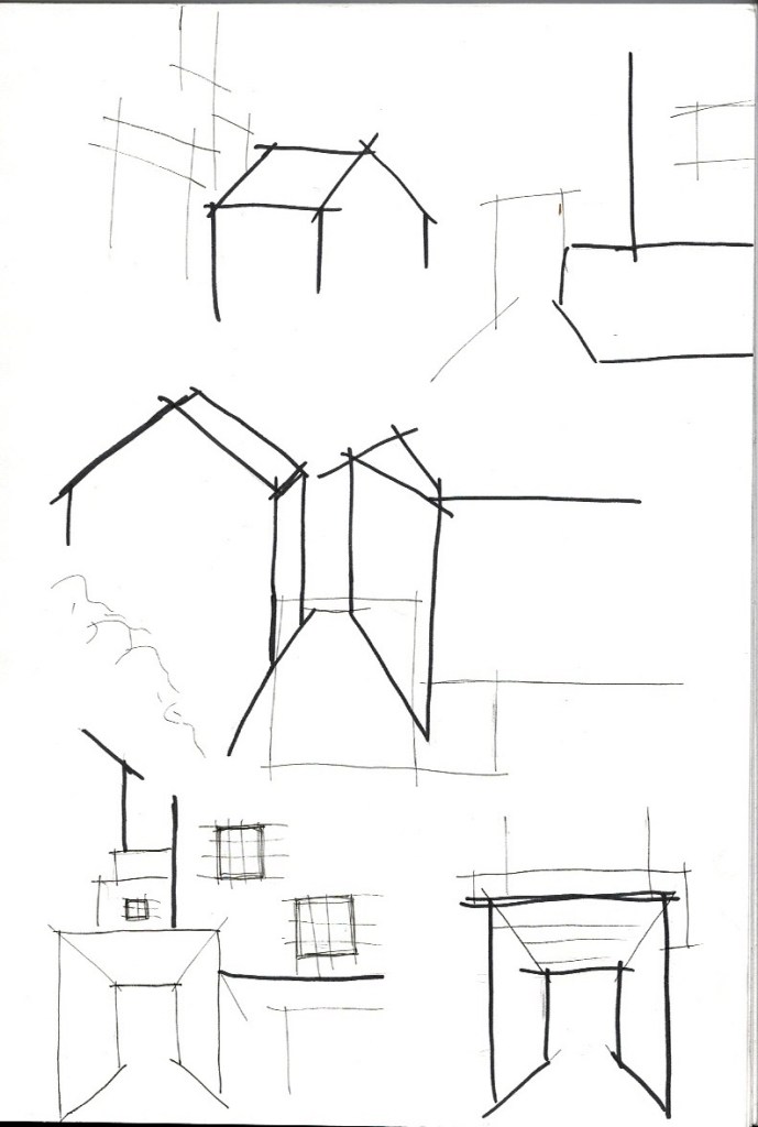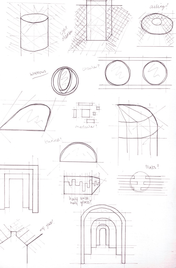 I then did some rough sketches of building designs. I experimented first with different shapes of buildings as shown below. I find drawing up as many different ideas as I can helpful in the process as as soon as it is out of my head and onto paper I can distinguish between the ones I like and dislike. I also experimented with other cladding textures and designs as I feel like this would play a good role in filtering light into the building.