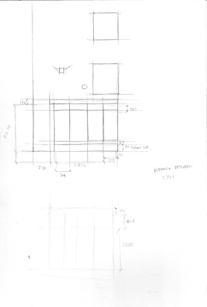 I did some rough sketches of the buildings surrounding the site and the view from the back. I wanted to get a feel of the shapes already evident in the buildings around it. I especially like the staggered effect created by the structures above the alley and I want to look at incorporating that into my design. Then I did a quick sketch of an elevation of the site taking down measurements so I could use these to create an elevation at a 1:20 scale and also to inform my building idea.